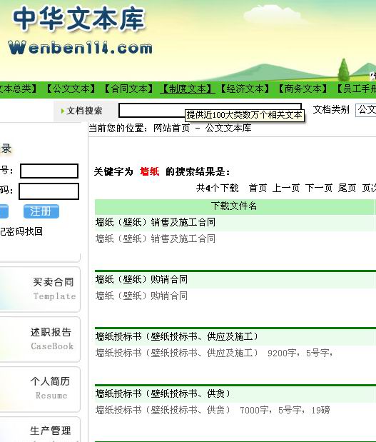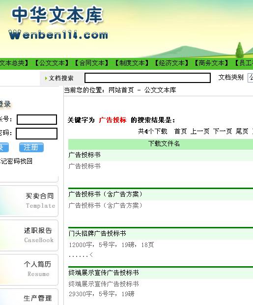 其中,公文文本(网址:http://www.wenben114.com/ArtDir.asp?ClassID=1)包括闭幕词、答谢词、调查报告、个人简历、求职信、自荐书、个人总结、各类规章制度、工作计划、工作要点、工作思路、工作设想、工作意见、工作总结、个人工作总结、欢送词、欢迎词、会议讲话、婚礼实用范本、竞岗演讲词、开幕词、领导讲话、庆典讲话、任职前发言、就职演说、落选发言、离职发言、申请书、实施方案、实施办法、实施意见、述职报告、思想汇报、演讲词、应用文、政府公文、致词、贺词、献词、主持词、自我剖析、心得体会、综合报告、综合讲话、求职封面、招标投标文本、其它范本等共5000余件优秀范文。