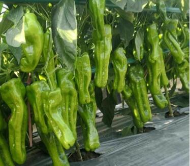 秋延越冬辣椒苗:进口品种,比国内品种增收20%以上,弱光照射、低温条件下连续坐果能力强,膨果速度快,果皮黄绿色,中前期坐果集中,后期不早衰。植株长势旺盛,抗病能力强,果长30-38cm。粗4-5cm,中等辣度。