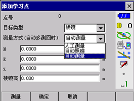 3. 可设置每个点的反射目标种类(无合作目标、反射片、圆棱镜、360°棱镜)、测量方式(人工测量、自动转动、自动照准、自动测量)
